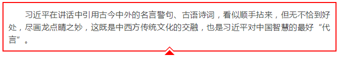 习近平这么实践 十八大以来,习近平对外出访数十次,无论是署名文章还是主旨演讲,他的讲话里始终充满着古今中外的优秀文化元素。广征博引、纵横捭阖,具有鲜明特点和魅力的“习式”语言给人留下了深刻印象。 在刚刚结束的“一带一路”国际合作高峰论坛上,习近平开场便引用《兰亭集序》中的名句“群贤毕至,少长咸集”来描述会议盛况,欢迎各国来宾。会上,习近平道出“不积跬步,无以至千里”“金字塔是一块块石头垒成的”“伟业非一日之功”,用中国、阿拉伯、欧洲的谚语名句强调同一个道理,即“一带一路”建设要稳扎稳打,久久为功,“一步一个脚印推进实施,一点一滴抓出成果”。 “相知无远近,万里尚为邻”,2016年11月,习近平在秘鲁国会发表演讲时引用了唐代诗人张九龄《送韦城李少府》中的名句,表明两国虽地理位置距离遥远,但是国家关系仍可以像邻居一样亲密。 “未之见而亲焉,可以往矣;久而不忘焉,可以来矣。”2016年1月,在阿盟总部演讲时,习近平引用这句两千多年前管子的话来讲述此行的重要意义。随后,他又道出孟子的“立天下之正位,行天下之大道”,进一步阐释中国对中东政策的坚持和立场,言简意赅,鞭辟入里。