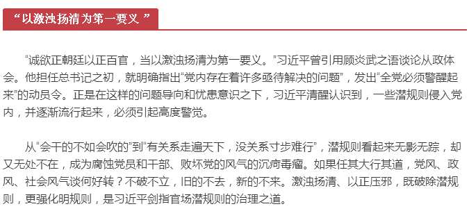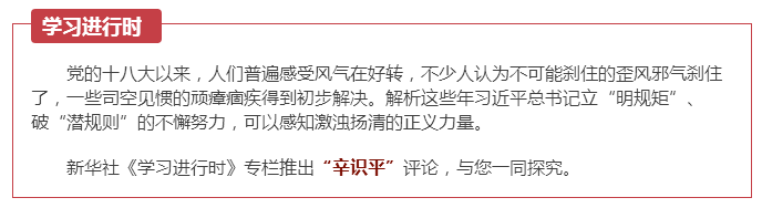 “面对众者皆墨,是不是法不责众,下不为例?不!法要责众,以戒今后!”今年两会上,习近平总书记在参加辽宁代表团审议时,说了一番振聋发聩的“硬话”。这话,不仅是针对辽宁拉票贿选案、湖南衡阳破坏选举案、四川南充拉票贿选案而言,更是向“法不责众”的官场潜规则亮剑! 人们还注意到,两会上,习近平对干部弄虚作假现象也亮明态度。他肯定辽宁“把数字誊清、见底、挤干水分”的做法,强调“绝不能搞数字脱贫”。这实际上是向一些地方“官出数字、数字出官”的“套路”说不。 党的十八大以来,人们普遍感受风气在好转,不少人认为不可能刹住的歪风邪气刹住了,一些司空见惯的顽瘴痼疾得到初步解决。面对这么多“万万没想到”,很多人都在思考:中国共产党为什么能?解析这些年习近平总书记立“明规矩”、破“潜规则”的不懈努力,可以感知激浊扬清的正义力量。