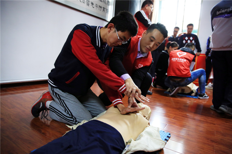 10月22日,泰安一中ALIVE意外求生与急救社70余名同学接受了来自泰安市中心医院应急办携手“男丁格尔”志愿团的男护们带来的心肺复苏急救知识的培训。 中心医院急救护士孟勐利用多媒体和现场示范的形式对师生们进行了心肺复苏急救培训,介绍了心肺复苏的操作要领,包括判断呼吸和意识、呼救、胸外按压、开放气道、人工呼吸等方面的知识,并就操作过程中的注意事项逐一进行示范。讲解结束后,10余名志愿者指导全体师生进行了分组练习,师生们争先恐后的动手操作,期间他们还向社团赠送了30册《卫生应急知识》宣传手册。 此次培训增强了师生的急救意识,丰富了急救知识,使同学们认识到发生意外伤害和突发事件时,要迅速进行自救、互救,争取最大程度地减少伤残、甚至死亡。活动凸显了急救常识从学生抓起的重要意义,活动结束后,参加培训的同学互相分享心得体会,同时意识到掌握急救技能、提高自救互救能力的重要性。