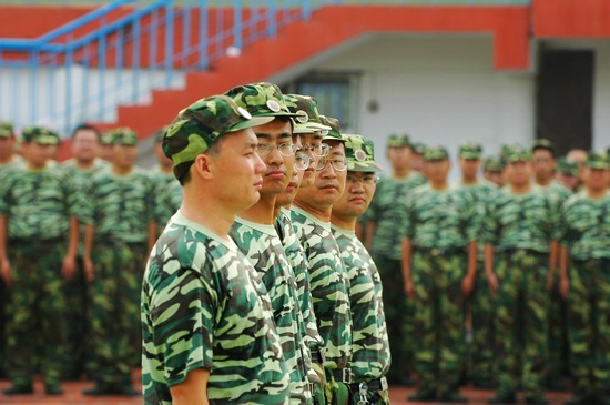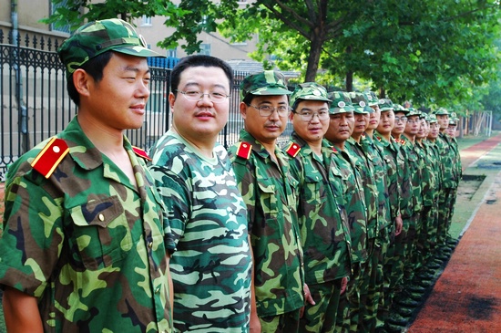 为加强我校教师队伍建设,进一步提高教师综合素质,加快“创名校、出名师、育名生”的步伐,在新生军训前,2004、2005级班主任、体育教师进行了为期两天的军事训练。图为精神抖擞、英姿勃发的参训教师。