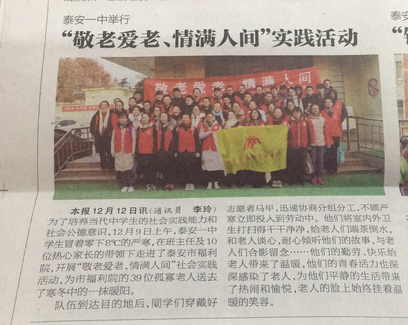 泰安日报:泰安一中举行“敬老爱老、情满人间”实践活动