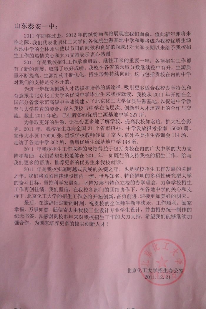 北京化工大学致我校感谢信