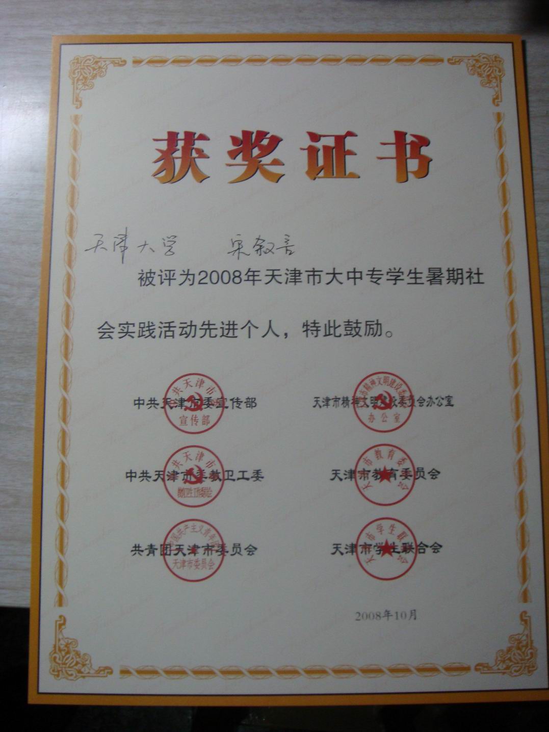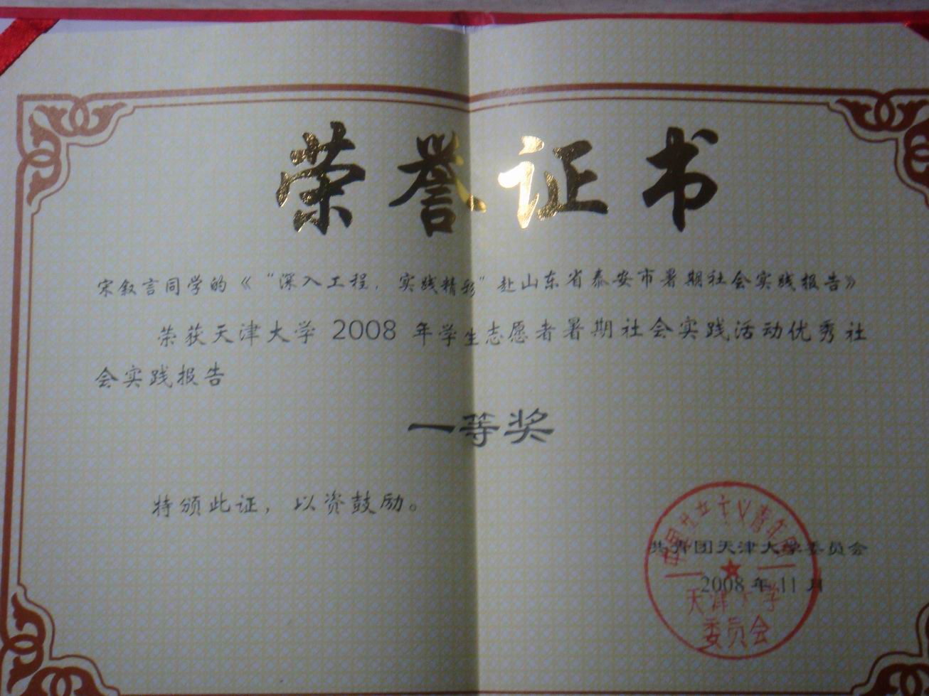 我校2006届毕业生宋叙言同学进入天津大学后展示出了优良的综合素质,表现出了较强的管理才能、实践能力和创新意识。2008年,他被学校聘为第六届学生社团团委书记,个人先后荣获2008年天津市大中专生暑期社会实践活动先进个人(全校仅10人获此奖,评选范围为天津市)、2008年天津大学学生志愿者暑期社会实践活动优秀社会实践报告一等奖、天津大学第九期“学生科技英才”称号(全校仅70人,从全部本科生、硕士生、博士生共3万人中评出)。