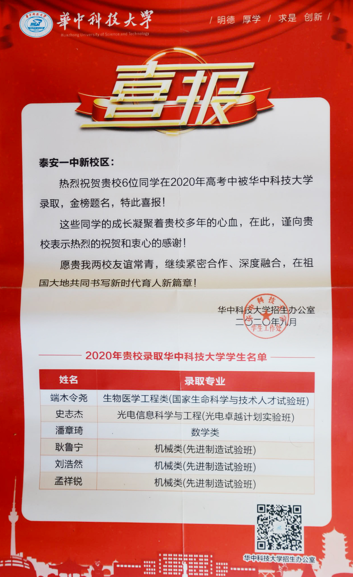 兰蕙芬芳,桃李争妍,不负韶华再追梦。2020年,泰安一中先后收到了清华大学、北京大学、复旦大学、中国科学院大学等50多所重点大学发来的喜报。泰安一中是北大、清华、复旦等全国近六十所重点大学命名的优质生源基地,领跑在为重点大学输送优秀生源学校的前列,每年学校都会收到大批高校发来的喜报、贺信。泰安一中历年培养的优秀毕业生不仅高考成绩优异、考上的名牌大学数量多,而且到了大学以后,综合素质全面、发展后劲足、可持续发展能力强。他们中有的获得国家奖学金,有的获得三好学生、本科特优生、优秀学生干部等荣誉称号,在不同的岗位上也屡创佳绩,为泰安一中争得了荣誉。 泰安一中坚持以学生为中心的办学思想,积极开发先进的课程体系。“一个中心、五个平台”的发展性课程体系为学生发展提供良好的平台。学校根据学生的兴趣爱好开设学科竞赛辅导,为学生的特长发展提供支持。学生在数学、物理、化学、生物、信息五大学科竞赛、作文大赛、英语竞赛中充分展现出个人的才质和特长,取得了优异成绩;学校不仅重视学习成绩,更着眼于学生的全面发展,重视学生综合素质的培养。学校每年的社团活动与课本剧展演、师生书画展、歌咏比赛、运动会等文体活动,发掘了学生的创新潜力,培养了学生的创新能力,提高了学生的综合素养,让学生的身心得到全面发展。 未来泰安一中将继续围绕出名师、育名生、创名校的办学目标,进一步完善、优化创新人才、拔尖人才的培养体系,打造适合学生全面发展、个性化发展的平台,让更多一中学生走入名牌大学,走向更广阔的发展舞台,为国家和民族振兴贡献力量。
