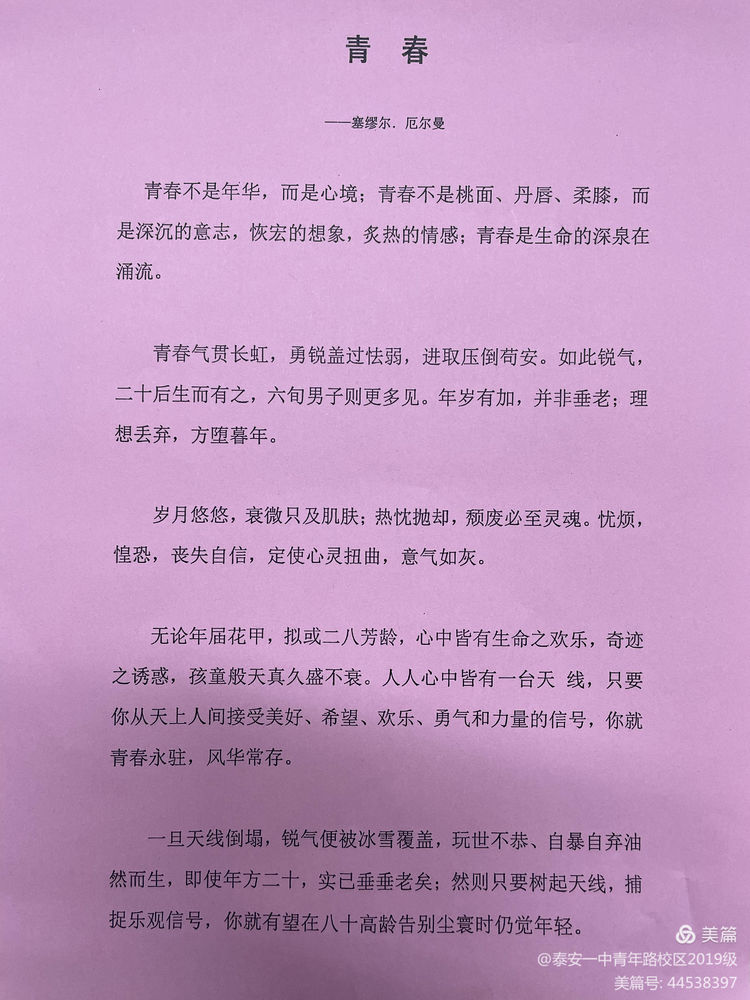 通过朗读塞缪尔·厄尔曼的《青春》,同学们感受到只有保持健康的心理状态,坚定自己的理想信念,才会青春永驻,风华常存。 青少年正处在心理机能迅速发育成熟的时期,因此,开展心理健康教育,让学生了解和掌握心理健康教育的相关内容就显得尤为重要。这不仅能促进青少年学生形成健康的心理和健全的人格,而且对构建平安校园与和谐社会也具有十分重要的现实意义。希望同学们能了解自我,悦纳自我;控制情绪,心境良好;正视压力,接受现实;乐于学习,热爱生活! |