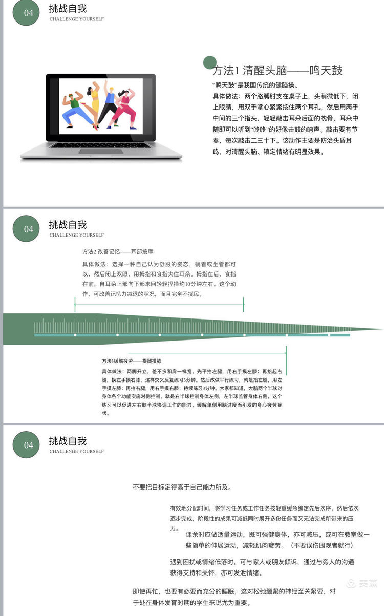 通过“挑战自我”,希望同学们能明白:要想背负压力走得久,就要懂得适当地放下,调整放松,选择合适的方式来减轻自己的压力。