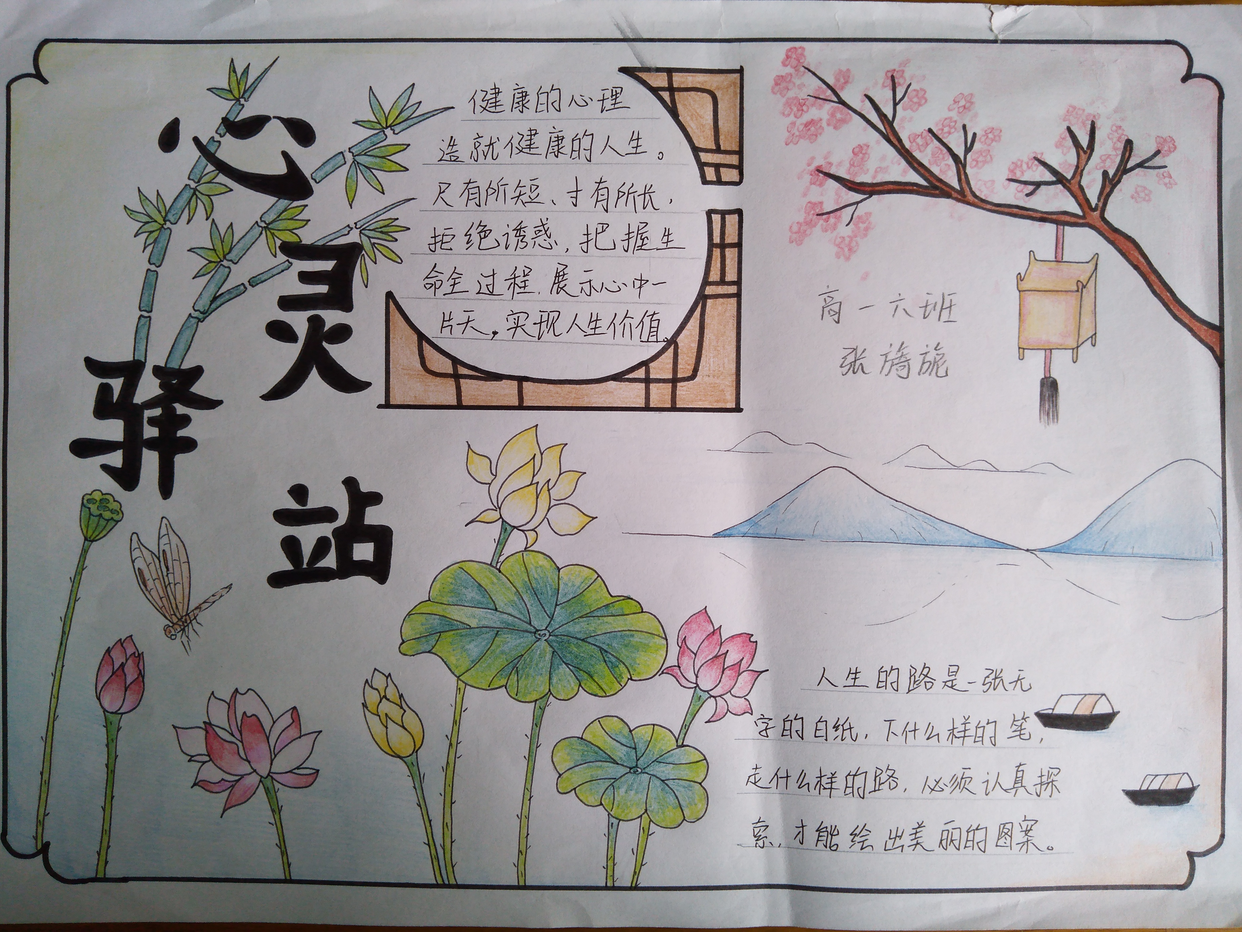 为了更好地普及心理健康教育常识,提高学生的心理自我调节能力,丰富学生的文化生活.近期,泰安一中开展了心理健康手抄报比赛活动。 本次手抄报活动的主题以心理健康教育常识为主,各班心理委员精心组织,同学们积极参与, 借助手中的画笔绘制成了一幅幅版面精美、内容丰富、布局新颖、短小精悍、书写清晰的手抄报作品。心理咨询室的老师和美术办公室老师组成了评审小组,经过认真的评比,本次心理健康手抄报比赛,评出一等奖15人,二等奖14人,优秀奖13人。 2021年心理健康手抄报比赛获奖名单: 一等奖15人 李怡然 王欣然 欧阳佳凝 张泽瑞 梁佳琪 马静怡 宋辰宇 王晓宇 孙淑贤 刘雅茹 王姿媛 张旖旎 王业凡 王雨菲 高 丰 二等奖14人 潘光耀 郭轩辰 李新实 和怡君 张建伟 侯韵函 杨一帆 张仁泽 赵 晨 王俊瑞 王文硕 褚心月 孙玉涵 吴再格格 优秀奖13人 张骞宇 刘旺运 张宪政 韩梦飞 张子恒 张凡锐 吕奕麟 马明阳 赵嘉丽 吕博文 次珠旺久 尼玛曲珍 桑吉卓玛 【部分获奖作品展】