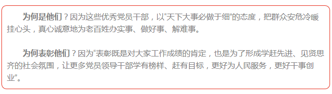 优秀党员干部:办实每件事,赢得万人心 各级党员干部的所作所为,关系到党风、政声。他们之中的优秀者,正是党“全心全意为人民服务”宗旨的体现。 近日,习近平作出重要指示,要求广大党员、干部要向廖俊波同志学习,不忘初心、扎实工作、廉洁奉公,身体力行把党的方针政策落实到基层和群众中去,真心实意为人民造福。习近平称廖俊波以实际行动体现了对党忠诚、心系群众、忘我工作、无私奉献的优秀品质,无愧于“全国优秀县委书记”的称号。 如廖俊波这样的榜样,有很多很多。 2015年6月30日,习近平在北京亲切会见百余名优秀县委书记,并发表重要讲话,提出殷切希望。这是时隔二十载后,中央再次大规模表彰优秀县委书记。 再往前追溯,还有一连串闪光的名字:焦裕禄、谷文昌、王伯祥、孔繁森、李林森、邓平寿、牛玉儒、邹碧华……他们,习近平从未忘记。
