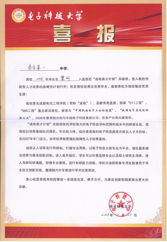 喜报我校2008届毕业生裴珂同学光荣入选电子科技大学“成电英才计划”实验班