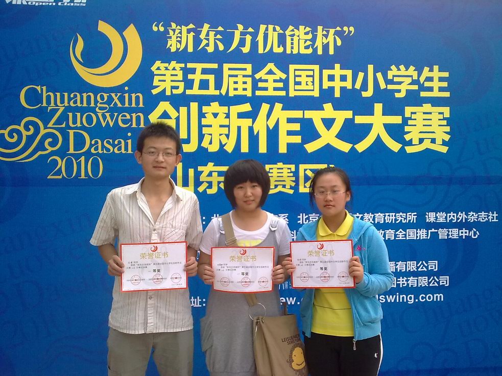 在5月29日结束的“新东方优能杯”第五届全国中小学生创新作文大赛山东分赛区决赛中,我校学生取得佳绩,3人获省一等奖,7人获省二等奖,24人获省三等奖。其中,获省一等奖的学生将参加今年7月25日于北京大学举办的全国总决赛,并有机会获得北京大学、山东大学、复旦大学、南京大学、南开大学、中山大学、长安大学等30余所高校的自主选拔推荐资格。同时,我校也被确定为“创新作文教育实验基地”。 全国中小学生创新作文大赛由北京大学中文系、北京大学语文教育研究所和课堂内外杂志社共同倡导、联合主办,大赛坚持公平、公正、公开的组织竞赛原则,分省(区、市)初赛、复赛和全国总决赛,为中小学语文课改和作文创新教育搭建了服务和交流平台,为全国重点大学选拔优秀高中生开辟了新的绿色通道,全国中小学生创新作文大赛正逐步成为全国规模最大,影响最广的作文赛事之一。