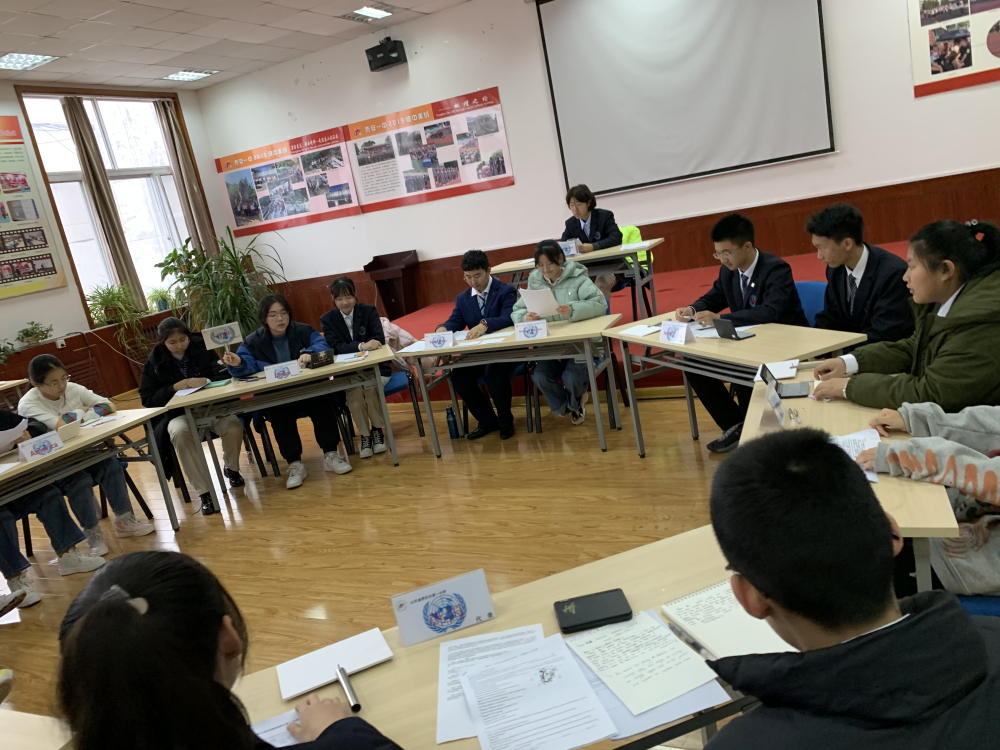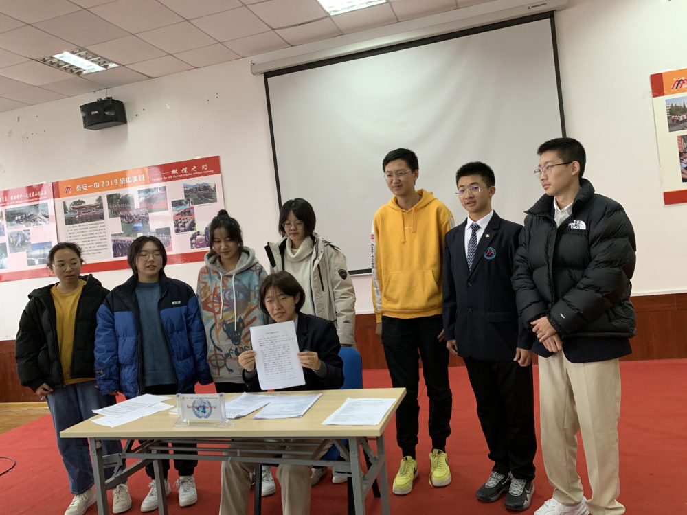 按照泰安一中国际部的课程和活动安排,经过数次观看联合国大会的实况视频和排练,11月23日上午,2019级中美班模拟联合国社团举行了第一次实战模联活动。