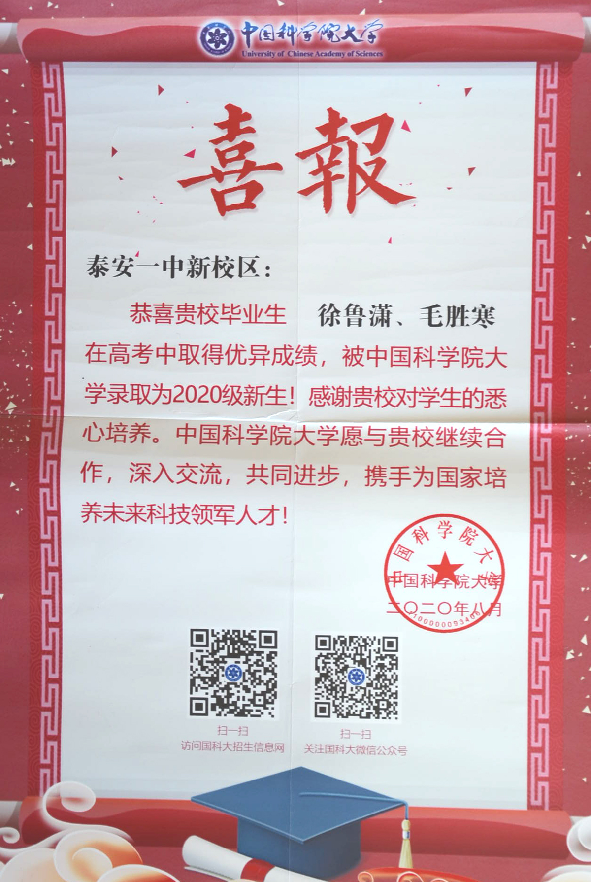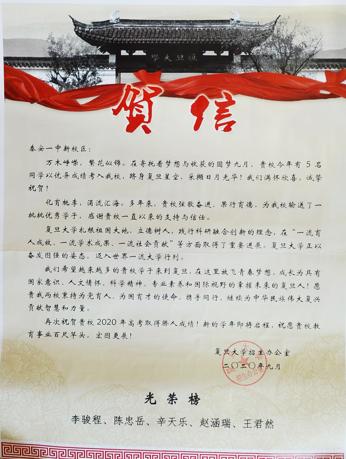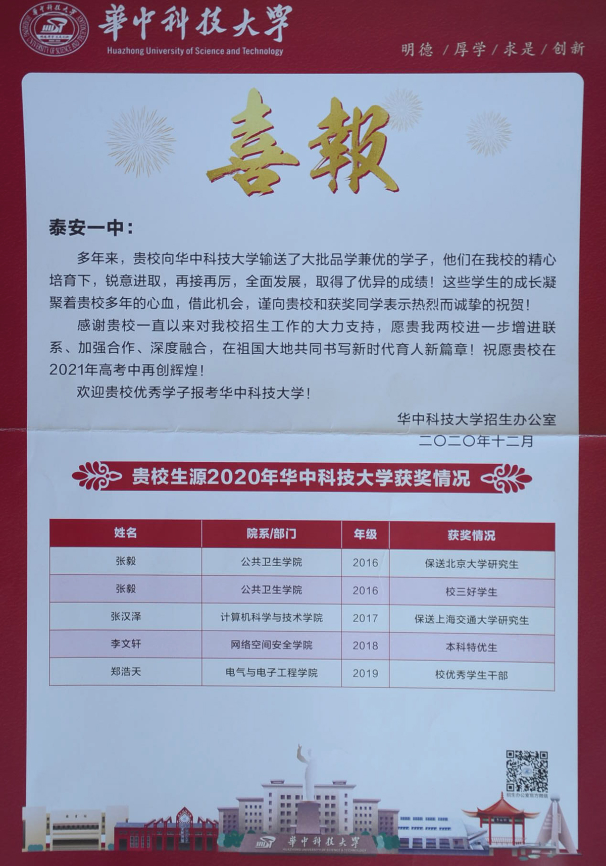 兰蕙芬芳,桃李争妍,不负韶华再追梦。2020年,泰安一中先后收到了清华大学、北京大学、复旦大学、中国科学院大学等50多所重点大学发来的喜报。泰安一中是北大、清华、复旦等全国近六十所重点大学命名的优质生源基地,领跑在为重点大学输送优秀生源学校的前列,每年学校都会收到大批高校发来的喜报、贺信。泰安一中历年培养的优秀毕业生不仅高考成绩优异、考上的名牌大学数量多,而且到了大学以后,综合素质全面、发展后劲足、可持续发展能力强。他们中有的获得国家奖学金,有的获得三好学生、本科特优生、优秀学生干部等荣誉称号,在不同的岗位上也屡创佳绩,为泰安一中争得了荣誉。 泰安一中坚持以学生为中心的办学思想,积极开发先进的课程体系。“一个中心、五个平台”的发展性课程体系为学生发展提供良好的平台。学校根据学生的兴趣爱好开设学科竞赛辅导,为学生的特长发展提供支持。学生在数学、物理、化学、生物、信息五大学科竞赛、作文大赛、英语竞赛中充分展现出个人的才质和特长,取得了优异成绩;学校不仅重视学习成绩,更着眼于学生的全面发展,重视学生综合素质的培养。学校每年的社团活动与课本剧展演、师生书画展、歌咏比赛、运动会等文体活动,发掘了学生的创新潜力,培养了学生的创新能力,提高了学生的综合素养,让学生的身心得到全面发展。 未来泰安一中将继续围绕出名师、育名生、创名校的办学目标,进一步完善、优化创新人才、拔尖人才的培养体系,打造适合学生全面发展、个性化发展的平台,让更多一中学生走入名牌大学,走向更广阔的发展舞台,为国家和民族振兴贡献力量。