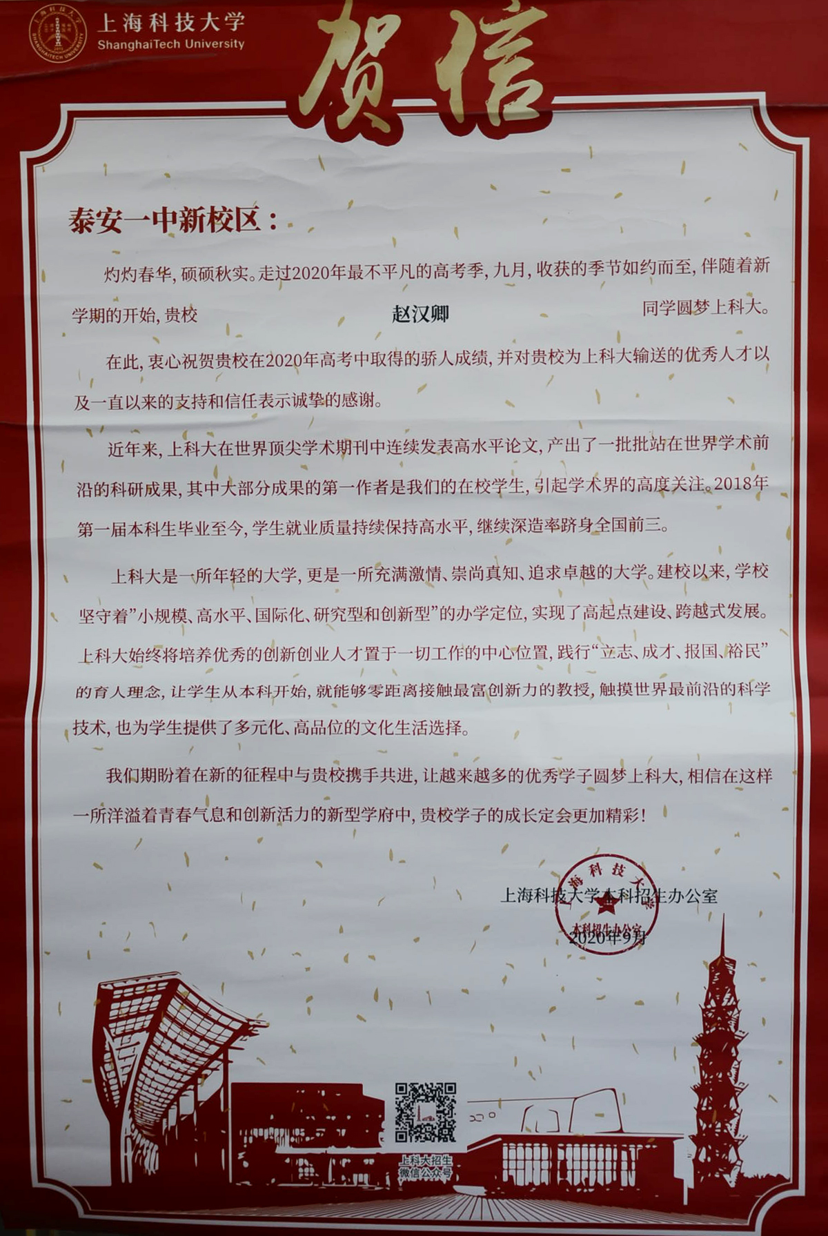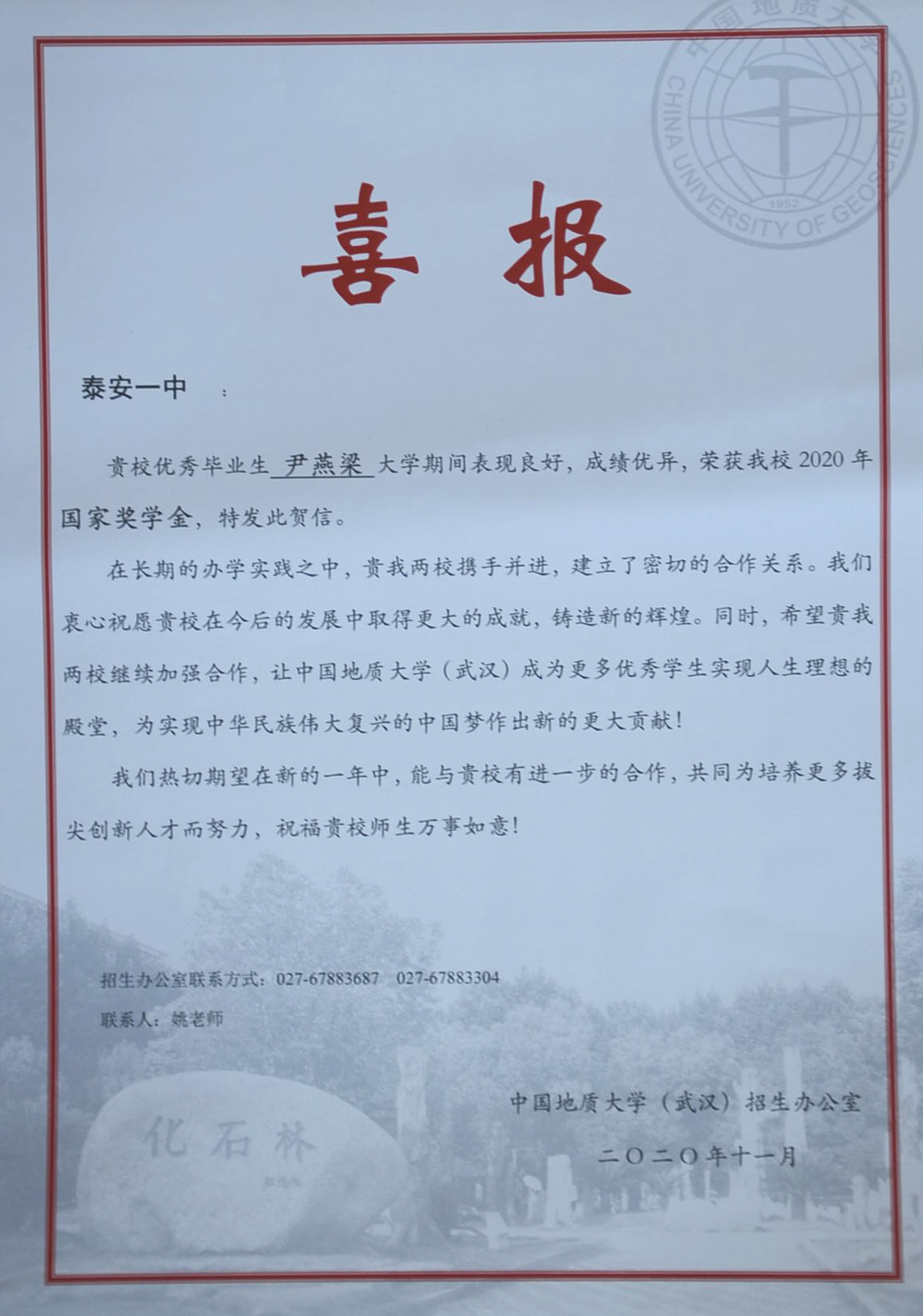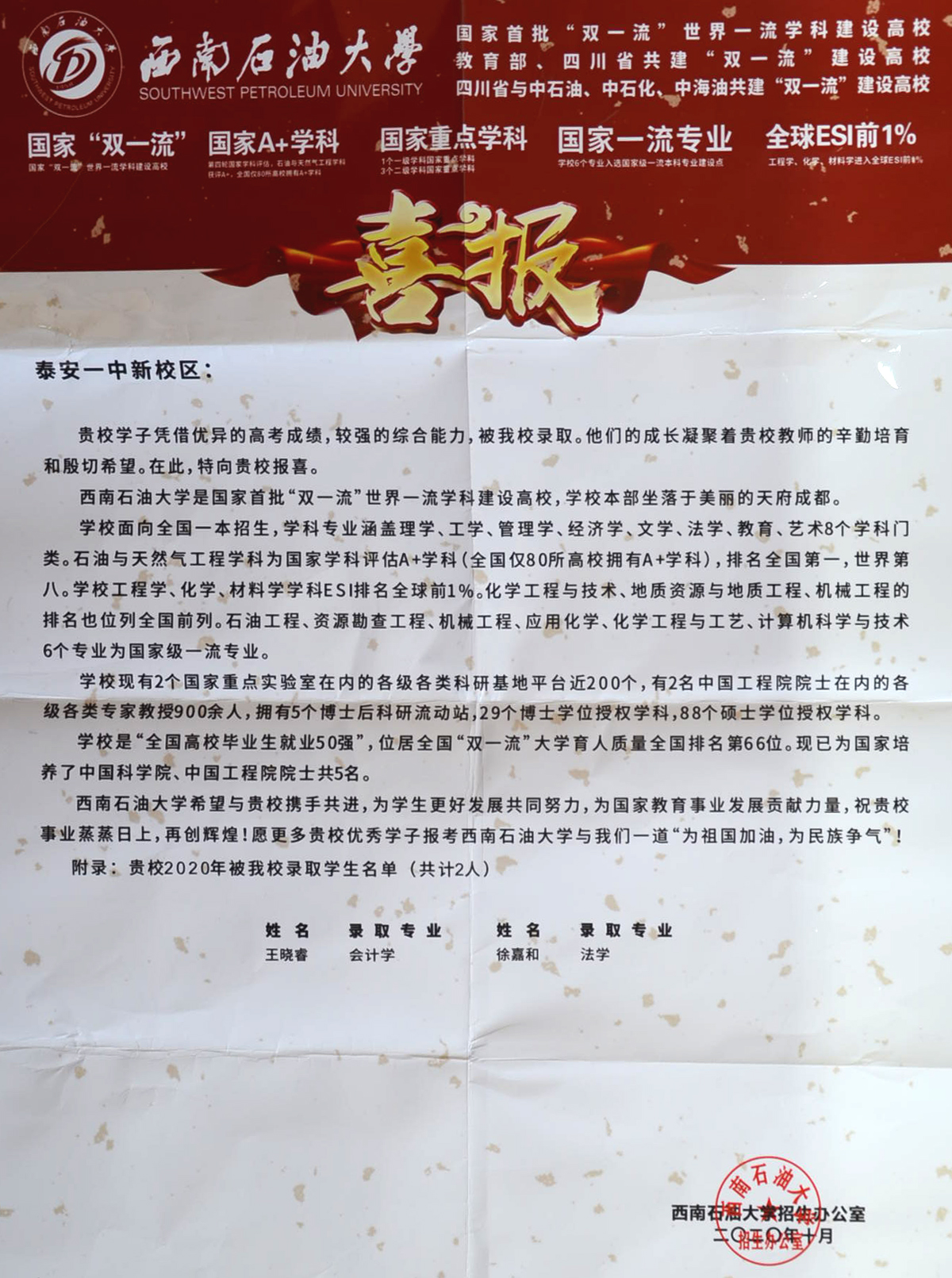兰蕙芬芳,桃李争妍,不负韶华再追梦。2020年,泰安一中先后收到了清华大学、北京大学、复旦大学、中国科学院大学等50多所重点大学发来的喜报。泰安一中是北大、清华、复旦等全国近六十所重点大学命名的优质生源基地,领跑在为重点大学输送优秀生源学校的前列,每年学校都会收到大批高校发来的喜报、贺信。泰安一中历年培养的优秀毕业生不仅高考成绩优异、考上的名牌大学数量多,而且到了大学以后,综合素质全面、发展后劲足、可持续发展能力强。他们中有的获得国家奖学金,有的获得三好学生、本科特优生、优秀学生干部等荣誉称号,在不同的岗位上也屡创佳绩,为泰安一中争得了荣誉。 泰安一中坚持以学生为中心的办学思想,积极开发先进的课程体系。“一个中心、五个平台”的发展性课程体系为学生发展提供良好的平台。学校根据学生的兴趣爱好开设学科竞赛辅导,为学生的特长发展提供支持。学生在数学、物理、化学、生物、信息五大学科竞赛、作文大赛、英语竞赛中充分展现出个人的才质和特长,取得了优异成绩;学校不仅重视学习成绩,更着眼于学生的全面发展,重视学生综合素质的培养。学校每年的社团活动与课本剧展演、师生书画展、歌咏比赛、运动会等文体活动,发掘了学生的创新潜力,培养了学生的创新能力,提高了学生的综合素养,让学生的身心得到全面发展。 未来泰安一中将继续围绕出名师、育名生、创名校的办学目标,进一步完善、优化创新人才、拔尖人才的培养体系,打造适合学生全面发展、个性化发展的平台,让更多一中学生走入名牌大学,走向更广阔的发展舞台,为国家和民族振兴贡献力量。